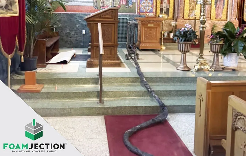 Foamjection levels church concrete by injecting high-density polyurethane foam beneath the slab. The foam expands to fill voids, lift the concrete, and restore firm support below the surface.
