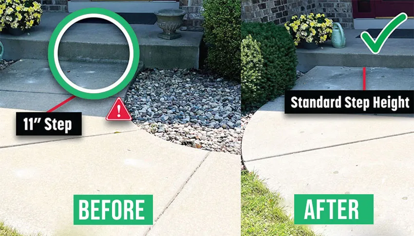 Uneven concrete steps create trip hazards and make entryways unsafe. As steps settle, the rise between them changes and edges shift out of alignment, increasing the risk of falls and surface damage.